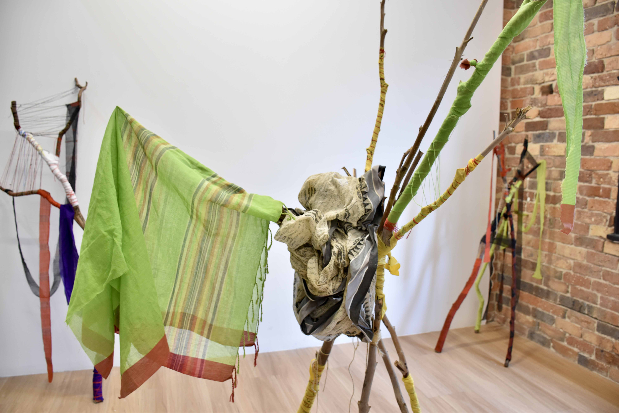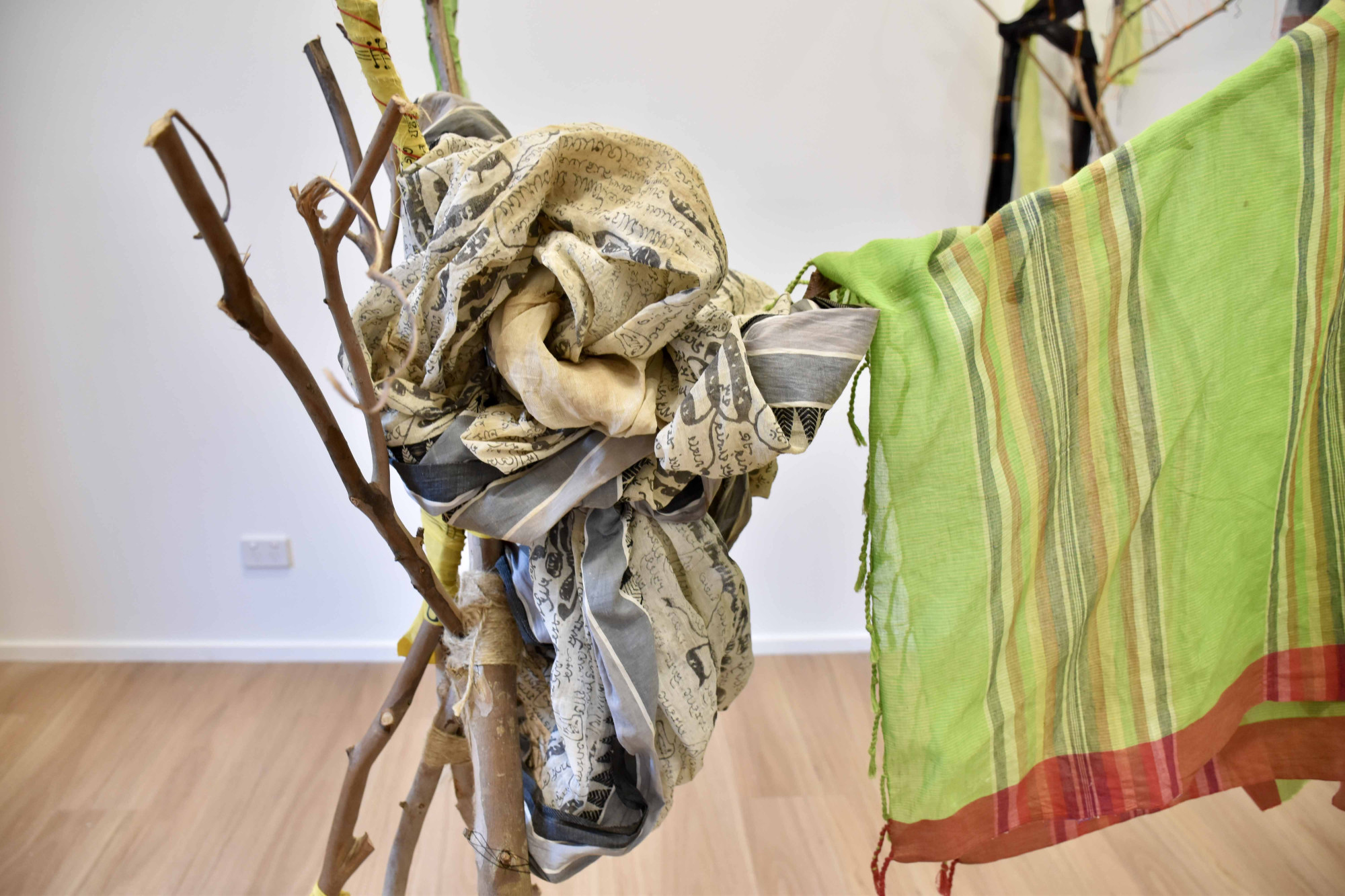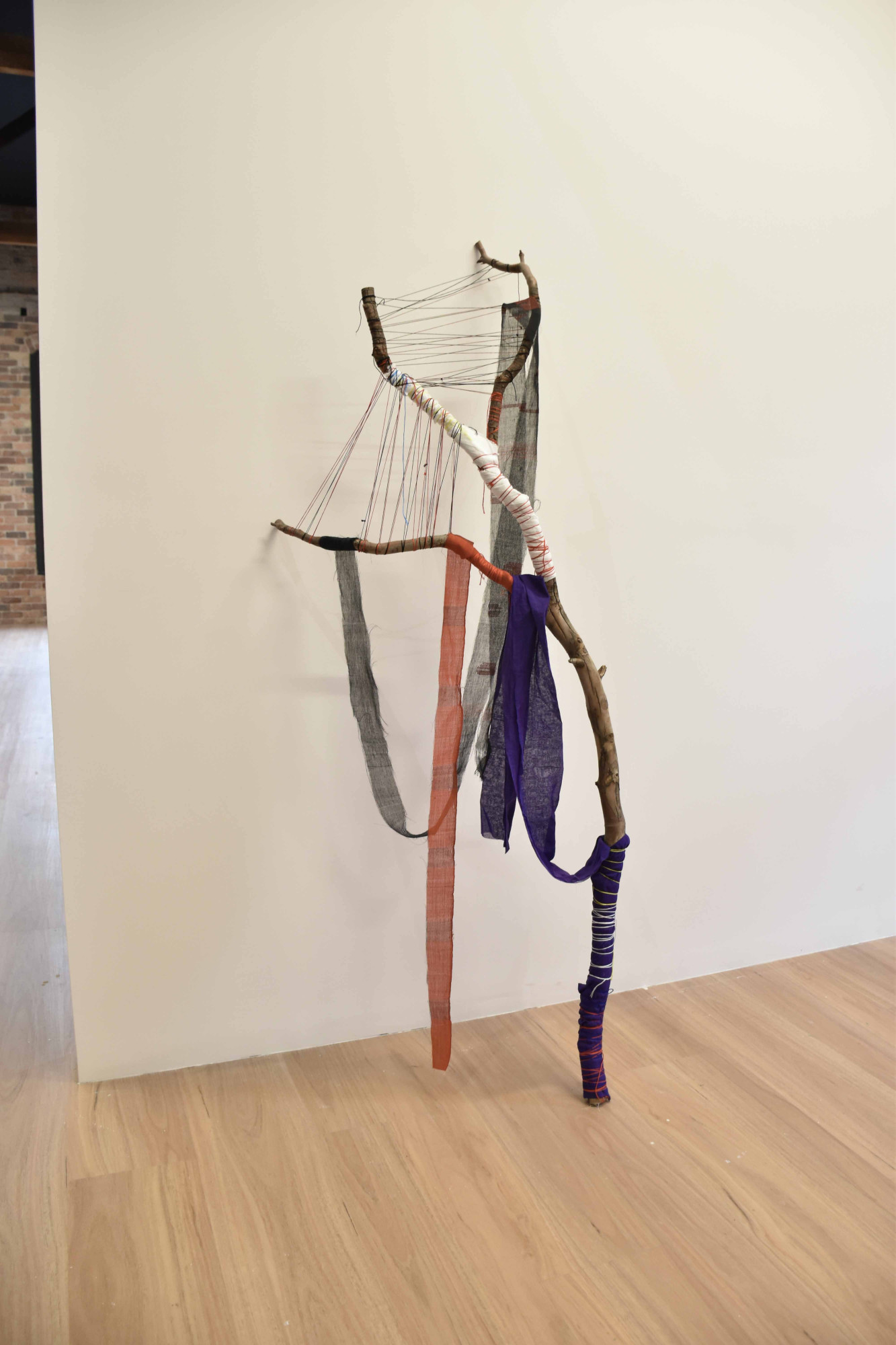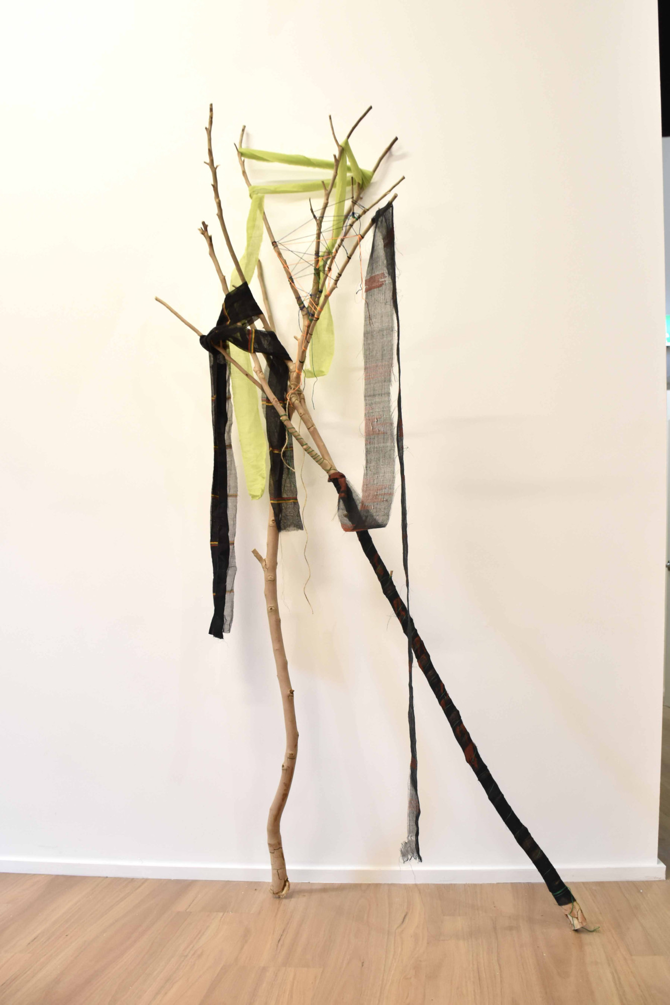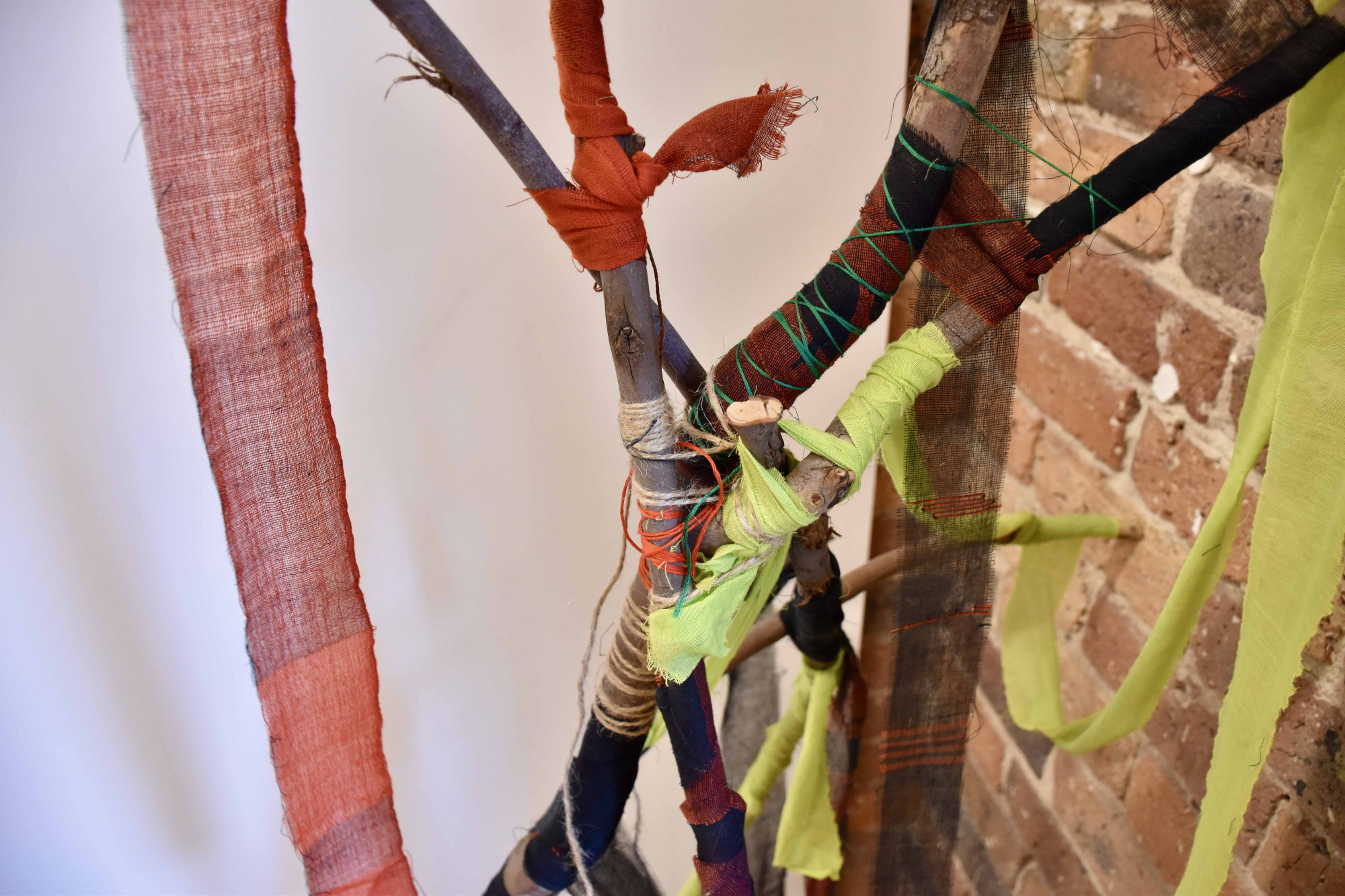 Image credit: Mita Chowdhury, Desire for Belonging 4, 2024, found tree branch, cotton saree, native Khadi fabric, and cotton threads, 186 cm x 76 cm x 49 cm.