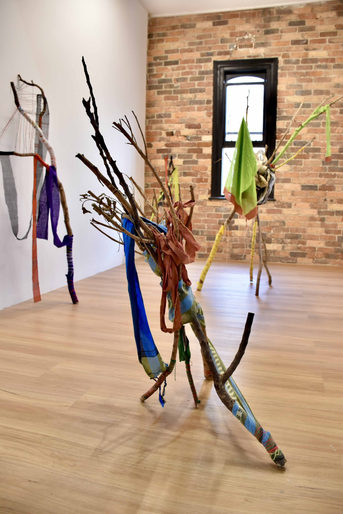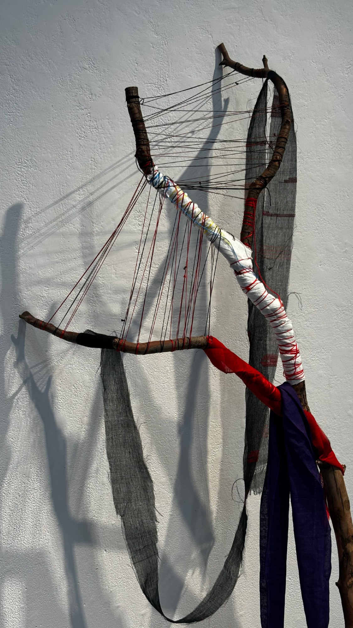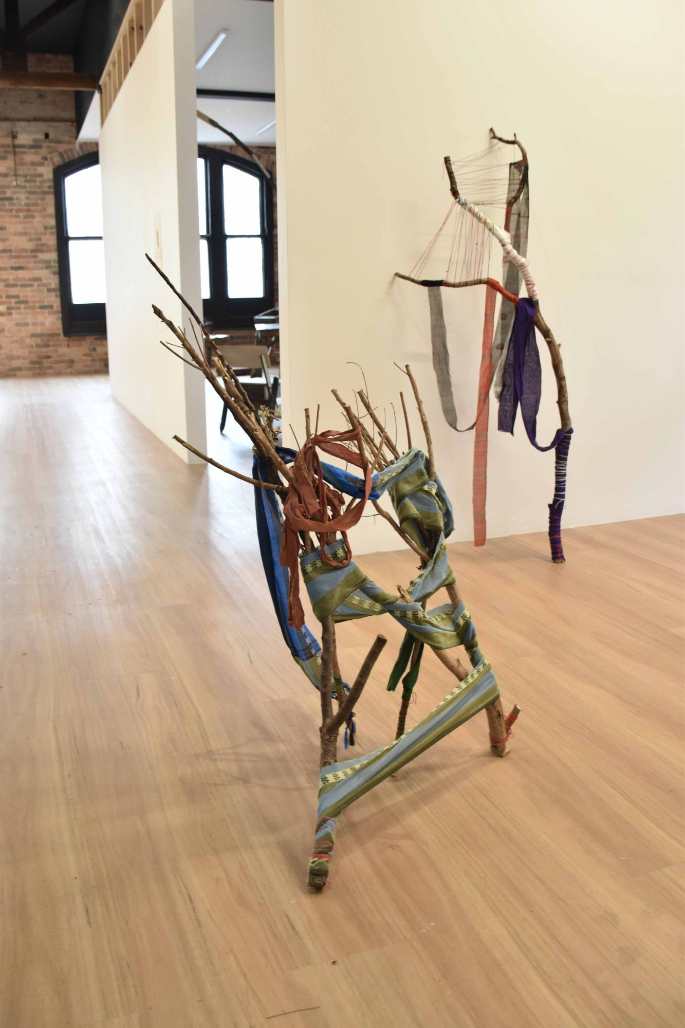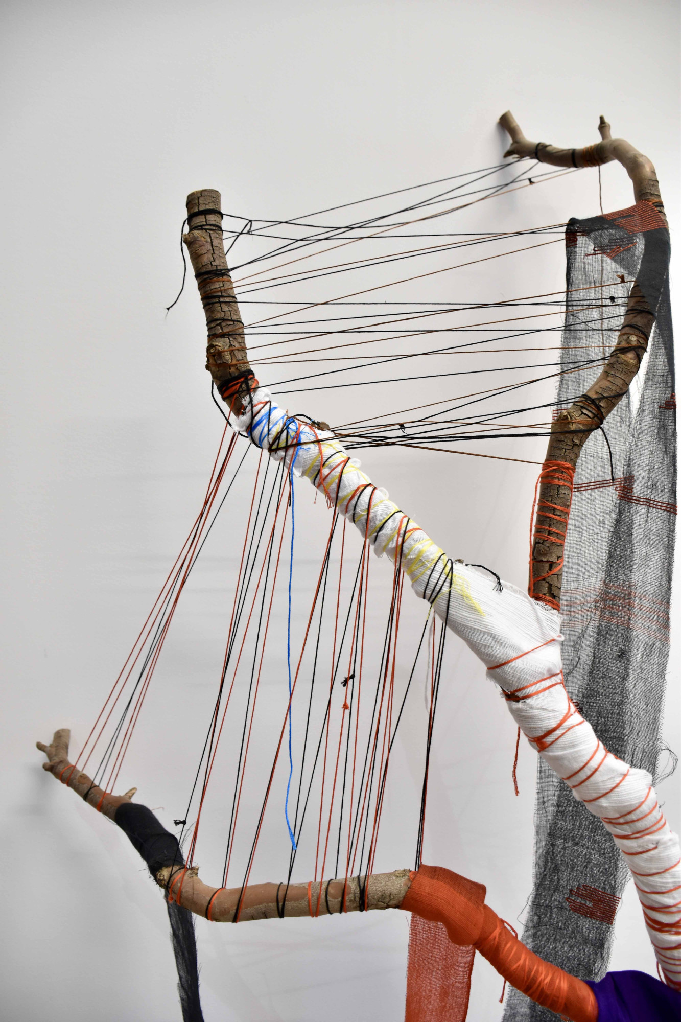 Image credit: Mita Chowdhury, Desire for Belonging 4, 2024, found tree branch, cotton saree, native Khadi fabric, and cotton threads, 186 cm x 76 cm x 49 cm.